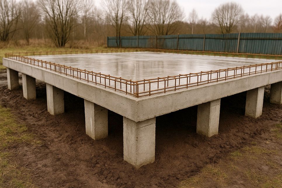 Свайно-ростверковый фундамент с плитой —комбинированная конструкция, объединяющая устойчивость свай, прочность ростверка и надёжность монолитной плиты. Такое решение особенно актуально для сложных грунтов и участков с перепадами рельефа. В этой статье разберём, как устроен этот тип фундамента, его достоинства, технические особенности и когда его стоит выбирать.